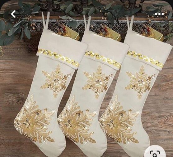 Cream pom-poms dangle playfully, making each stocking feel special (and a little whimsical). Write names in elegant silver script for a personalized, boutique vibe, they’ll look luxe but inviting.