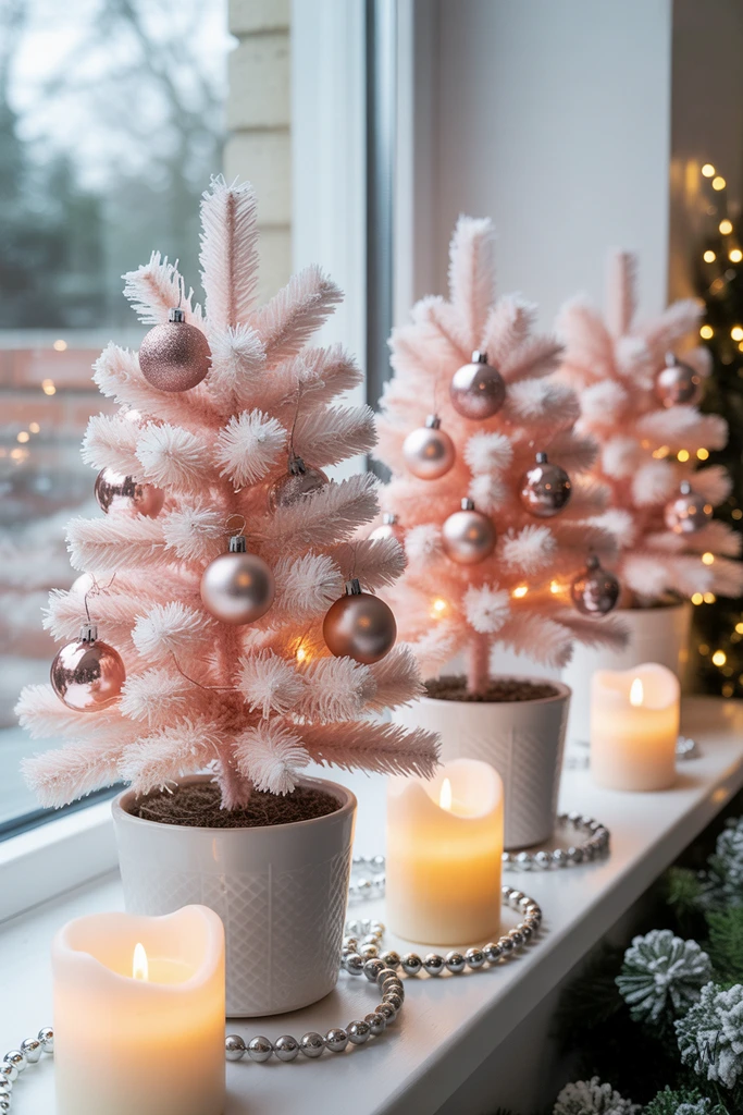 Soft blush pink mini trees bring a dreamy, almost candy-like vibe to your holiday setup-especially when clustered on a window sill. Choose petite, bottle-brush trees in pale pink shades, then anchor them in clean white ceramic pots for a fresh, modern look.