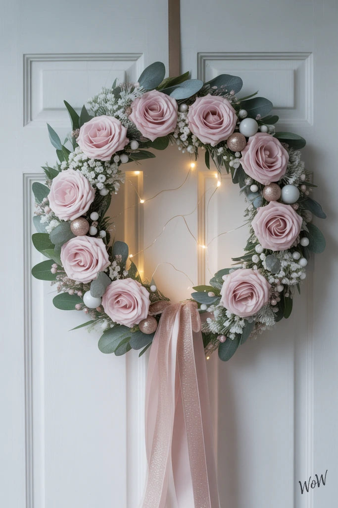 To DIY this look, start with a simple grapevine or foam wreath base and attach faux or real blush pink roses, tucking in sprigs of baby’s breath and eucalyptus. Wire in a few silver ornaments for that festive pop.