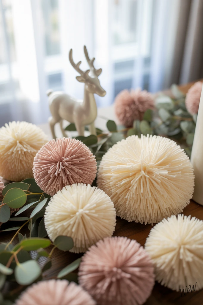 Cream and blush pink pom-poms instantly add a playful, soft touch to your holiday table, their fuzzy textures just beg to be touched. Scatter them across the table runner, tucking a few between eucalyptus sprigs for a fresh, modern vibe, or nestle them near white ceramic reindeer for a whimsical touch.