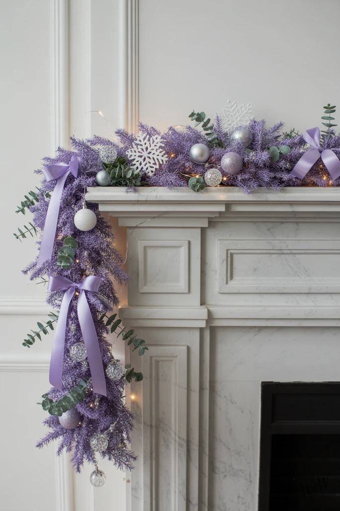 Soft lavender garland brings a gentle, unexpected twist to your holiday mantel. Drape it loosely across a white marble fireplace for a luxe, airy vibe; let the ends puddle slightly for a relaxed feel.