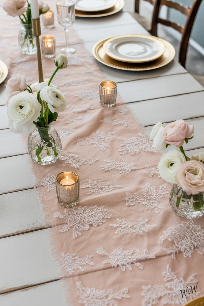 Soft, light coral instantly livens up a whitewashed table, especially when layered with a white lace overlay for extra texture. Lay the runner right down the center and let the lace spill over the edges, it’s a subtle way to make things feel both romantic and festive.