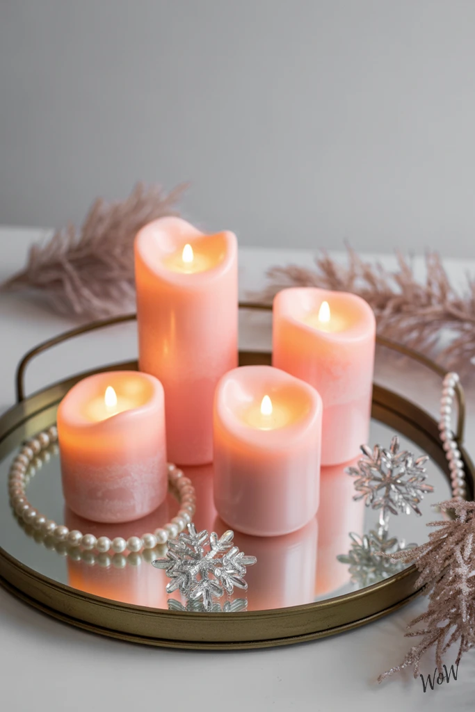 Soft pink LED candles in different heights add such a dreamy, romantic vibe, especially when grouped together on a mirrored tray, their glow bounces off the glass, making everything sparkle a little more. Toss a few pearl beads around the candles and tuck in some blush-toned eucalyptus sprigs-these touches make the whole setup feel lush but effortless.