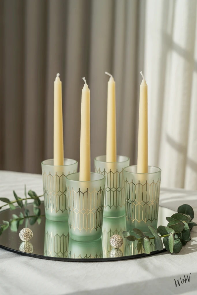 A set of mint green frosted glass candle holders with gold geometric patterns instantly gives your table a fresh, dreamy vibe, especially when you group them on a mirrored tray. The mint color feels modern but soft, and the frosted glass diffuses the candlelight, so you get a cozy, gentle glow instead of harsh brightness.