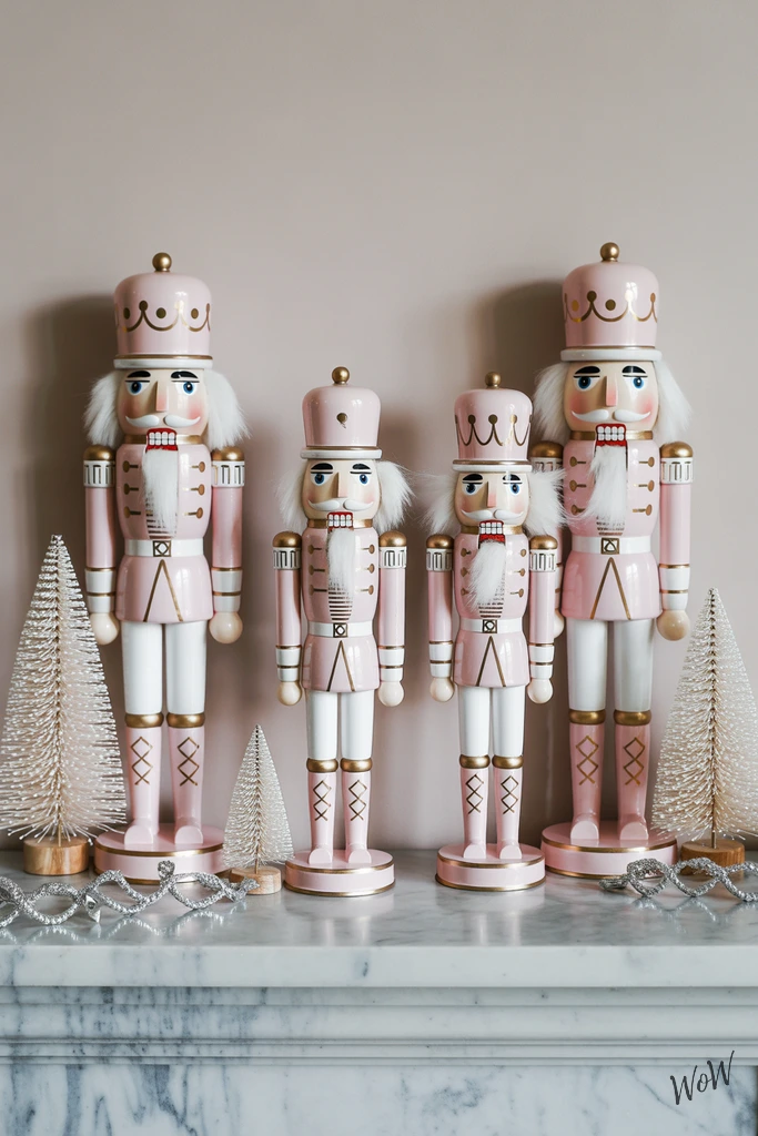 Pale pink nutcracker figurines add a sweet, unexpected twist to your holiday shelves-skip the classic red and green, and go for soft pastels with shimmery gold accents. To pull this off, gather a few nutcracker soldiers in varying heights, then spray paint them a gentle blush pink (or buy them pre-painted if you spot some).