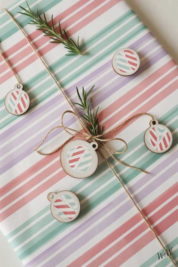 Pastel candy cane stripes give gifts a fresh twist-swap out traditional red and white for pretty bands of mint green, baby pink, and lavender. Look for matte wrapping paper with those soft, alternating stripes, it’s cute but not loud.