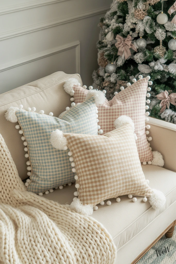Soft pastel plaid throw pillows instantly make your space feel both festive and soothing, especially when you go for baby blue, blush pink, and mint green patterns. Layer them on a cream sofa-those white pom-pom trims are a playful detail, they catch the eye and add texture without going overboard.