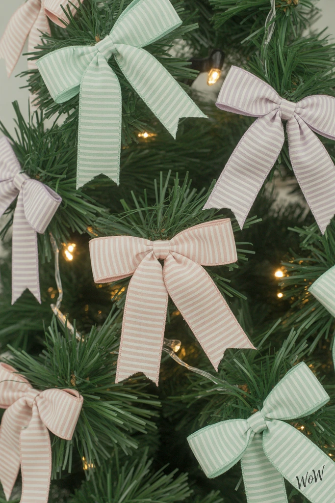 Pastel striped ribbon bows add a dreamy touch to your Christmas tree, the soft mint green, baby pink, and pale lavender tones feel fresh and playful without losing any elegance. Grab wide, satin or grosgrain ribbons with subtle stripes-bonus points if you can find a mix of widths for extra texture.