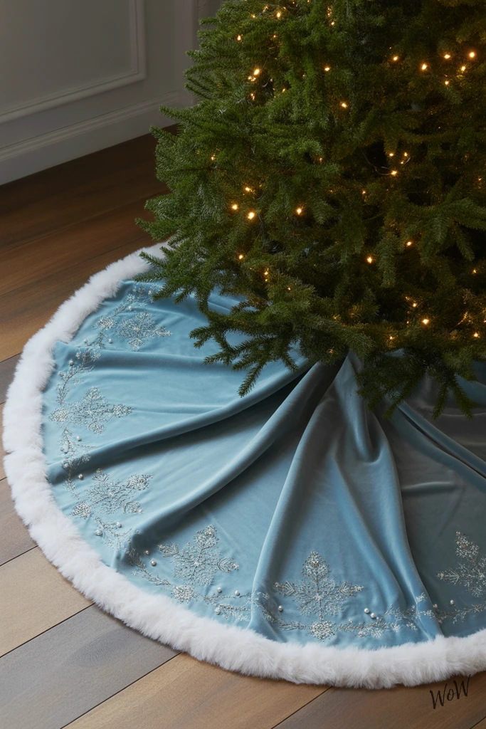 Powder blue velvet instantly brings a fresh, upscale vibe to your tree base, especially when it’s finished with scalloped edges and little silver snowflakes embroidered throughout. The subtle shimmer threads woven in catch the glow from your Christmas lights, so the whole look feels soft but really elegant.