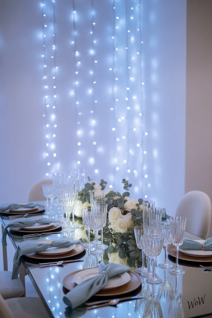 Anchor them in gentle, uneven lengths for that flowing, cascading vibe. When the lights hit your silver chargers and pale blue napkins, everything shimmers a little, and the centerpiece of white roses with silver eucalyptus leaves really pops.