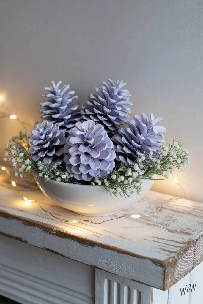 Delicate pinecones in soft lilac and lavender shades instantly give your mantel a dreamy, wintery vibe. All you need are some natural pinecones, pastel acrylic paints, and a little silver glitter-just brush on the colors, sprinkle the glitter while the paint’s still tacky, and let them dry.