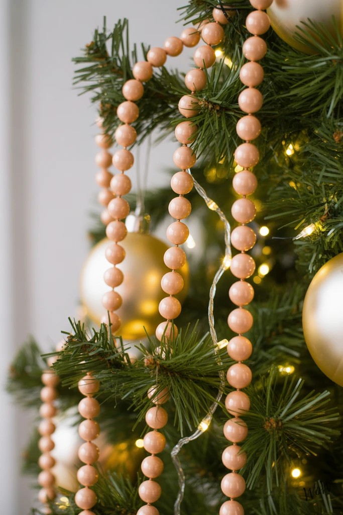 Soft peach beaded garlands drape gracefully over the branches, adding a gentle, romantic vibe to your Christmas tree. When you layer them with warm white fairy lights, the glass beads catch every glimmer and reflect it back, giving the whole tree a subtle, magical shimmer.