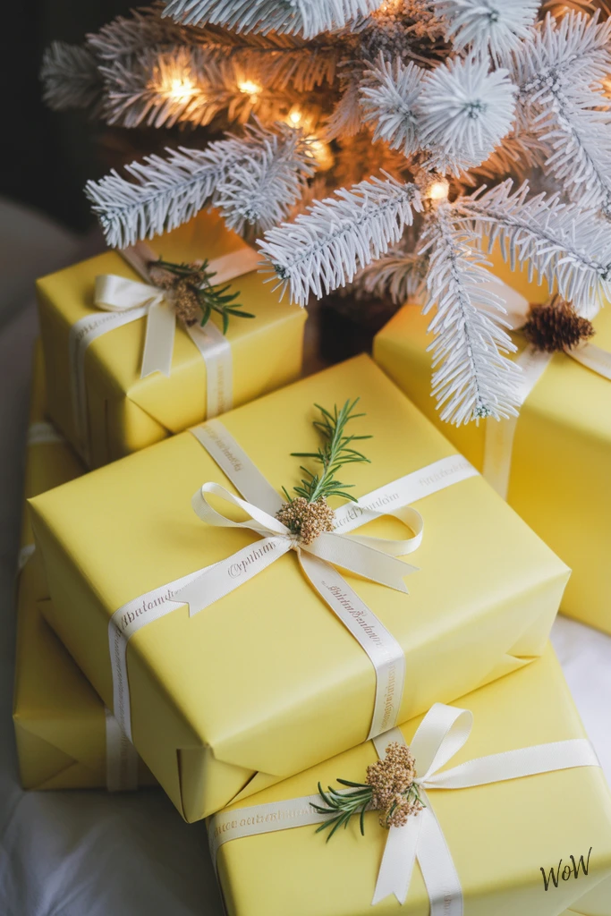 Soft yellow gift wrap brings a gentle, sunlit vibe to your holiday decor, especially under a glowing white Christmas tree. Choose buttery yellow wrapping paper-it’s warm without being too bold.
