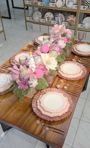 9. Elegant Pink Holiday Tablescape with Shimmering Ornaments