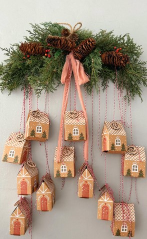 This pink-themed advent calendar is a sweet and whimsical way to count down the days until Christmas. Tiny house-shaped boxes, each designed with festive details, hang delicately from soft pink ribbons tied to a lush arrangement of greenery and pinecones. The mix of natural textures with gentle blush tones creates a charming, cozy look that feels both festive and feminine. It’s the perfect blend of rustic and elegant, bringing warmth and excitement to your holiday décor. Whether filled with small treats or daily surprises, this creative advent calendar adds a magical, handmade touch to your Christmas celebrations and looks stunning displayed on any wall or door.
