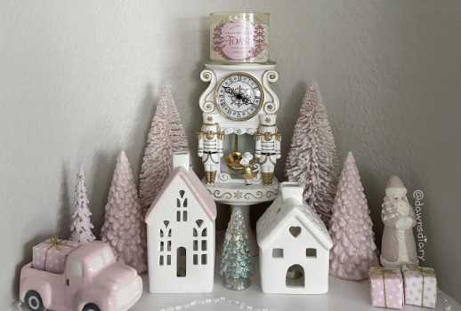 A pink-themed Christmas village creates an enchanting miniature world on your mantel or sideboard. The scene tells a whimsical story with each little building, figurine, and detail working together.