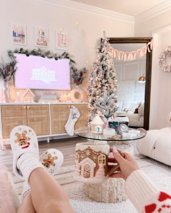 Shades of blush, ivory, and champagne blend beautifully throughout the space, creating a cozy yet elegant atmosphere. A frosted tree sparkles with pink ornaments, metallic accents, and twinkling lights, while garlands, stockings, and miniature houses continue the pastel theme.