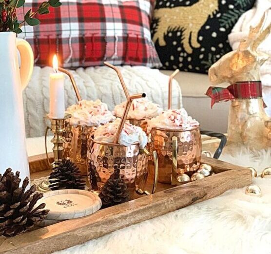 Copper mugs make any holiday spread feel extra festive, especially when they’re catching the glow from candlelight. For a cozy, rustic look, fill them with steaming mulled wine, letting the deep reds and floating spices-cinnamon sticks, star anise-peek out the top.