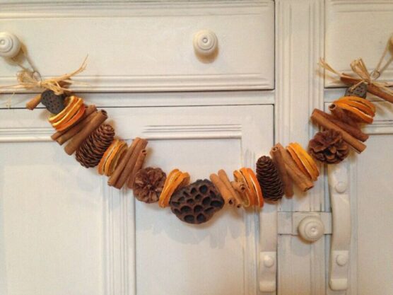 Stringing up a pinecone garland will cozy up your fireplace, especially when you add dried orange slices and cinnamon sticks, the look is pure rustic charm. Gather some pinecones (store-bought or collected on a walk), thread twine through or around their tops, and knot them in place.