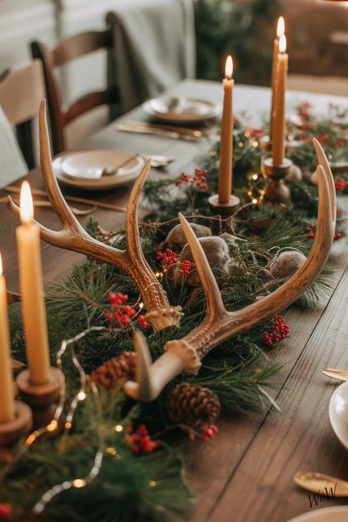An antler centerpiece will give your table that rustic, cabin-in-the-woods vibe, especially when you use naturally shed deer antlers-they look wild yet elegant. Start with a solid, antique wooden table for the base, then arrange the antlers in the middle, weaving in fresh pine branches and a few pinecones to add texture.