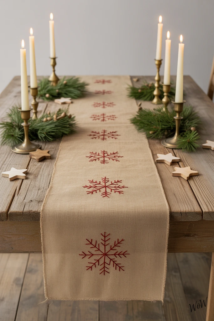 A burlap table runner adds rustic warmth to your holiday table, especially when it’s hand-stitched and topped with red embroidered snowflakes. The rough, earthy texture of burlap looks right at home on a weathered farmhouse table, it’s both cozy and unfussy.