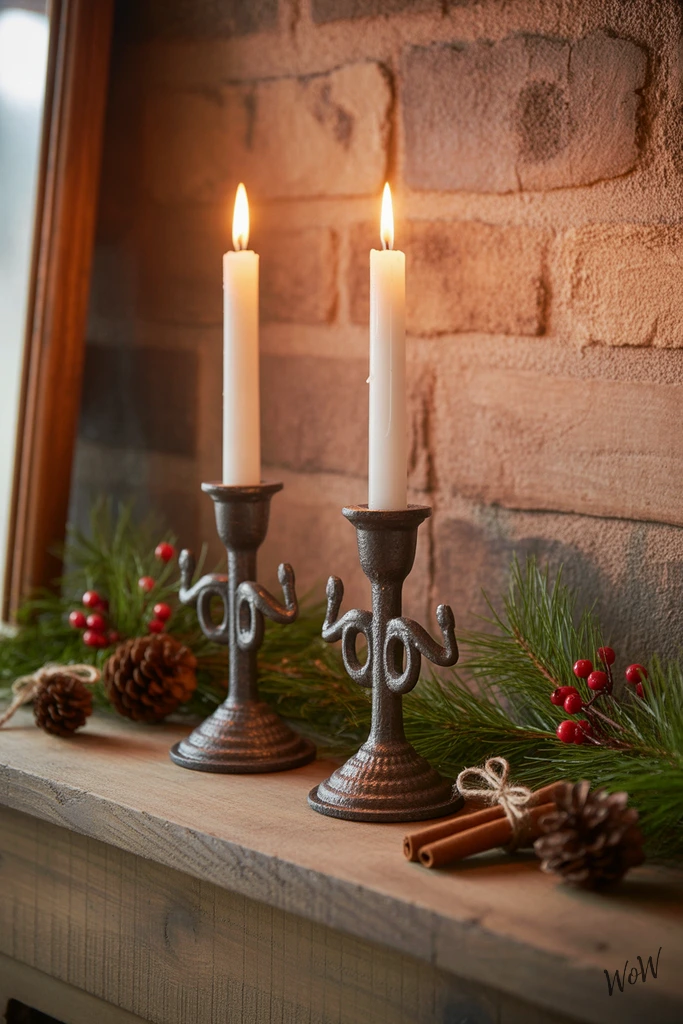 Cast iron candle holders have a certain old-world charm, especially when they’re weathered and full of character. Set a few on a reclaimed wood mantel, letting them anchor the space with their vintage-inspired, intricate details.