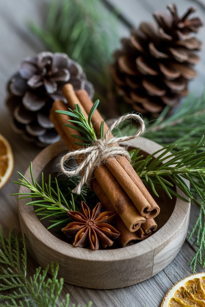 Cinnamon stick bundles bring instant coziness to any space-they smell incredible and look like something straight from a mountain cabin. Grab a handful of cinnamon sticks, tie them up with twine, and tuck in little sprigs of rosemary for a pop of green.