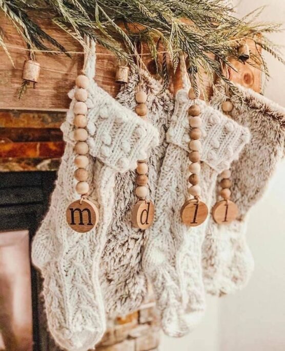 Stockings with pine tree motifs or textured stitches add that extra woodland touch, especially when they’re hanging from a reclaimed wood mantel. Personalize each stocking by tying on a wooden letter tag, it feels thoughtful and looks great with rustic decor.