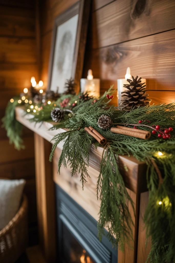 Tuck in real pinecones, cluster some tiny red berries, and add a few cinnamon sticks for natural texture and a subtle festive scent. Weave in a strand of tiny white twinkle lights, it’ll cast a warm, inviting glow that bounces off the garland and highlights the rough wood behind it.