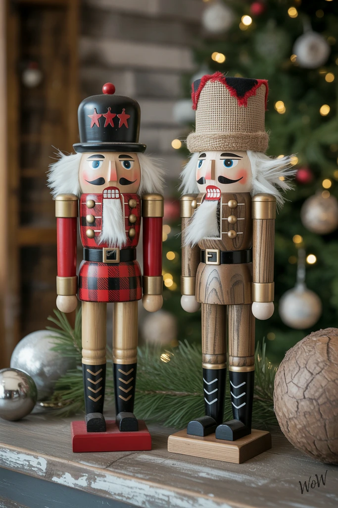 Farmhouse style nutcrackers swap out the usual glitz for cozy, homespun charm-they’re all about weathered wood finishes and soft, muted tones. Instead of shiny paint, these nutcrackers wear buffalo plaid scarves, burlap sashes, and little tufts of faux fur, giving them a relaxed, wintry vibe.