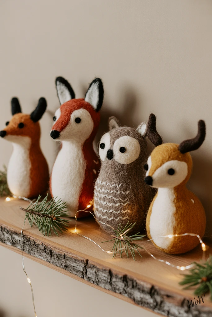 The felted wool’s texture brings warmth and depth, showing off the handwork’s charm. Whether you buy them from a local maker or try needle felting yourself, these critters add cheerful, homespun character to your holiday display.