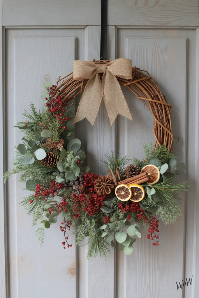 Layer in pine and eucalyptus, tucking stems into the grapevine; clusters of wild red berries, pinecones, and dried citrus slices add texture and pops of color. For a cozy, inviting scent, wire on a few cinnamon sticks.