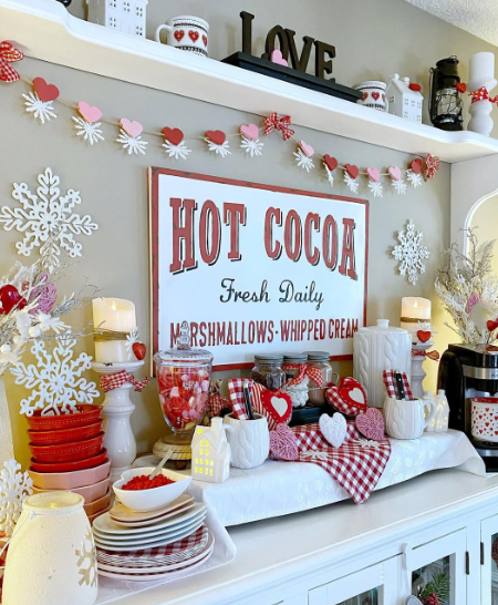 Use a vintage metal tray to corral an assortment of ceramic mugs, antique silver spoons, and a copper pot of steaming chocolate, it’s a mix that feels both homey and special. Frame the whole display with a pine garland and twinkling fairy lights, the greenery and soft glow add serious cabin vibes.
