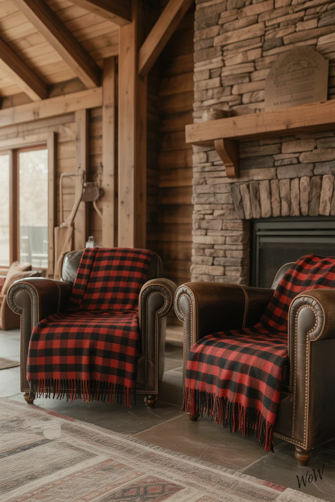 Red and black buffalo plaid throw blankets bring that classic cabin vibe, especially when they’re draped over distressed leather armchairs. The chunky woolen texture feels super cozy, and those tasseled edges give just the right amount of detail-it’s the kind of spot anyone wants to curl up with a book.