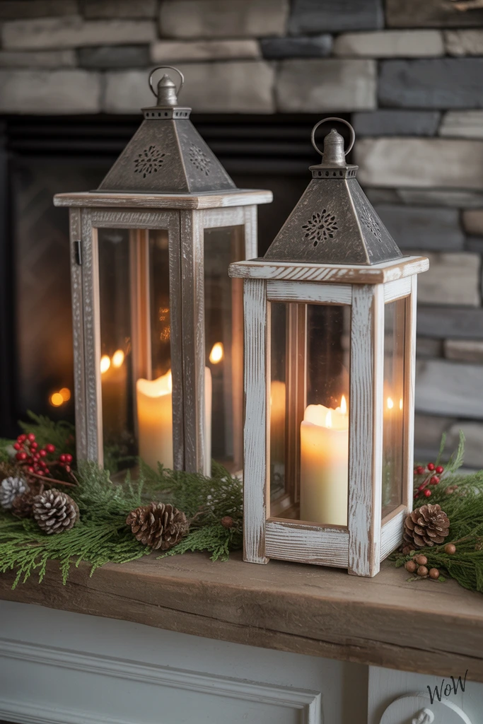 Place a couple of these lanterns on a rough-hewn mantel, tucking in fresh evergreen sprigs, clusters of red berries, and a handful of pinecones all around for texture. The natural elements soften the wood and metal, tying everything together against a rugged stone fireplace backdrop.